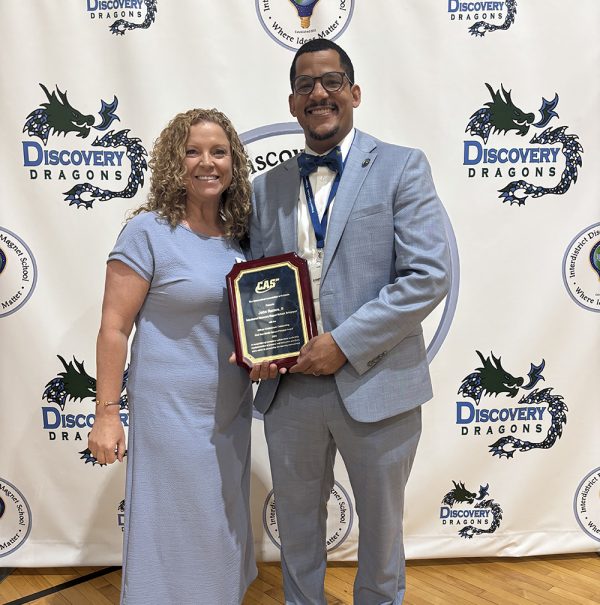 Pictured at right is Tiffany Caouette, assistant executive director of the CT Association of Schools, and John Ramos II, principal of Interdistrict Discovery Magnet School in Bridgeport and recipient of the 2025 William Cieslukowski Outstanding First-Year Principal Award.